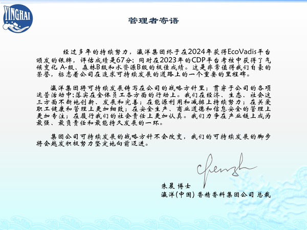瀛洋集团规范了内部一系列商业行为规则,包括信息安全、反贿赂、反腐败、反不正当竞争、诚实自律,所有重要职位的员工均接受相应的培训并签署承诺;编制并发布了《供应商社会责任行为规范》,供应商评估将包括产品质量、环保、职业健康与安全,以及社会责任。瀛洋集团2020年注册RSPO(棕榈油可持续发展圆桌会议)会员,积极参与棕榈油的可持续发展规划,瀛海和瀛洋相应的产品均取得了RSPO的认证。...
